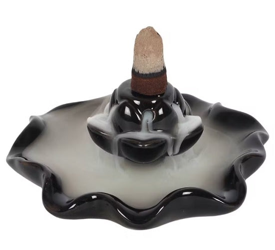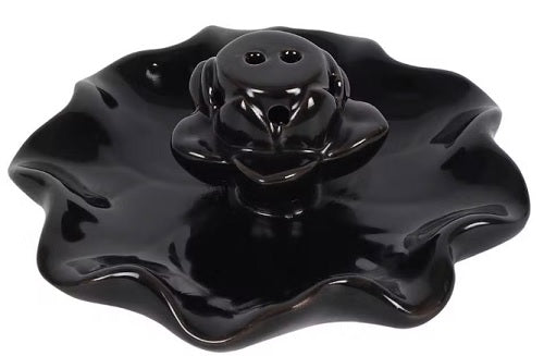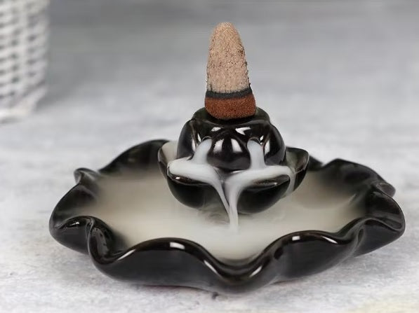 A simple yet beautiful back-flow incense burner in a black ceramic lotus pool design.